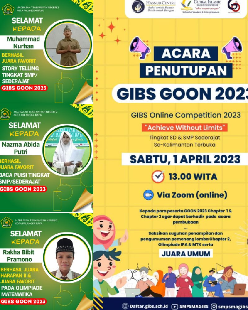 Prestasi yang membanggakan kembali ditorehkan peserta didik Madrasah Tsanawiyah Negeri (MTsN) 2 Kota Palangka Raya, kali ini dari Bidang Akademik yaitu juara pada Lomba GIBS GOON Tahun 2023 yang diselenggarakan oleh Global Islamic Boarding School secara online, diikuti siswa siswi tingkat SD/SMP sederajat se-kalimantan.