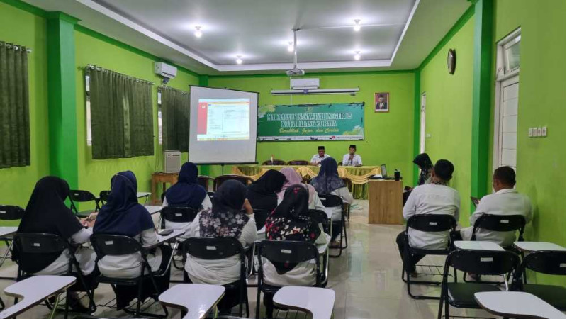 Pengawas Pembina Madrasah Tsanawiyah Negeri (MTsN) 2 Kota Palangka Raya Jumikun melakukan sosialisasi tentang Pemilihan Umum kepada tenaga pendidik di lingkungan MTsN 2 Kota Palangka Raya di aula. Senin (5/2/2024).