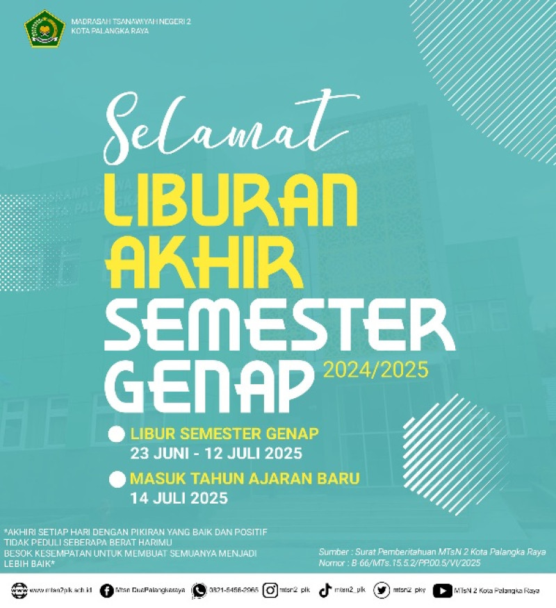 MTsN 2 Kota Palangka Raya akan memasuki masa libur akhir Semester Genap Tahun Pelajaran 2024/2025 terhitung mulai tanggal 23 Juni hingga 12 Juli 2025. Seluruh kegiatan pembelajaran dan aktivitas madrasah akan dihentikan sementara selama masa libur tersebut.