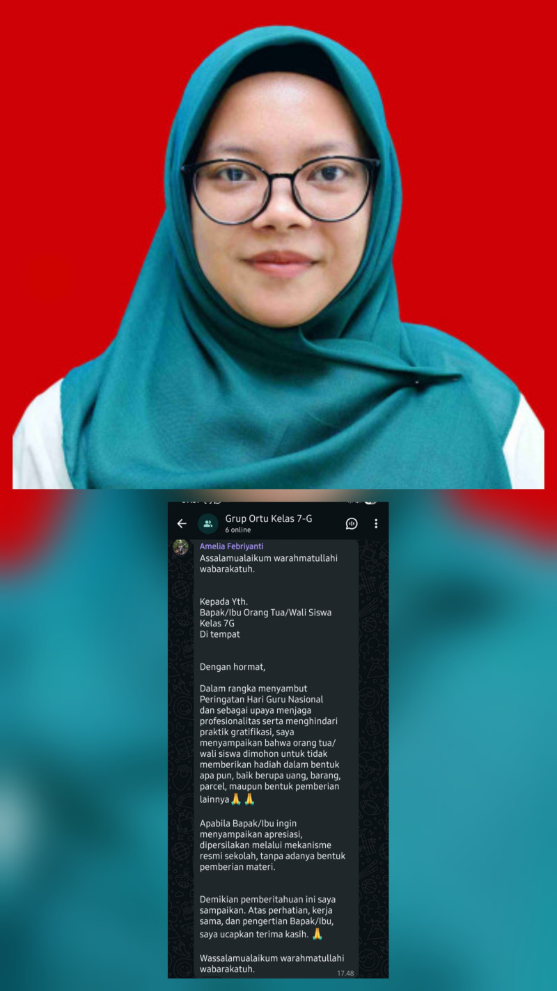 MTsN 2 Kota Palangka Raya kembali menunjukkan komitmennya dalam menjaga profesionalitas dan integritas tenaga pendidik. Melalui grup kelas, Wali Kelas 7G, Amelia Febriyanti, menyampaikan imbauan penting kepada orang tua dan peserta didik terkait peringatan Hari Guru Nasional (HGN) tahun 2025. Dalam pesannya, Amelia menegaskan bahwa dirinya tidak menerima hadiah dalam bentuk apa pun, baik berupa barang maupun uang, dari peserta didik ataupun orang tua.