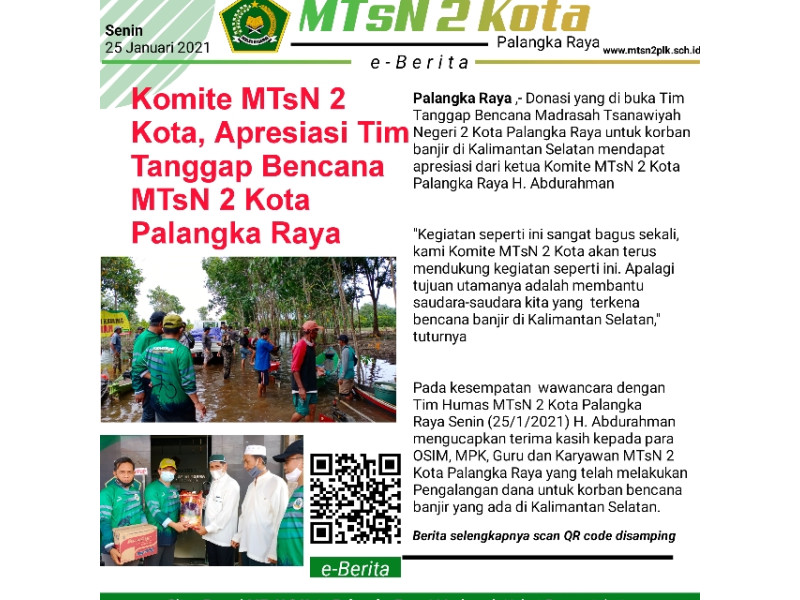 Donasi yang di buka Tim Tanggap Bencana Madrasah Tsanawiyah Negeri 2 Kota Palangka Raya untuk korban banjir di Kalimantan Selatan mendapat apresiasi dari ketua Komite MTsN 2 Kota Palangka Raya H. Abdurahman"Kegiatan seperti sangat ini bagus sekali, kami Komite MTsN...