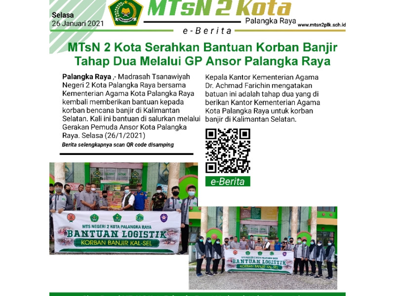 Madrasah Tsanawiyah Negeri 2 Kota Palangka Raya bersama Kementerian Agama Kota Palangka Raya kembali memberikan bantuan kepada korban bencana banjir di Kalimantan Selatan. Kali ini bantuan di salurkan melalui Gerakan Pemuda Ansor Kota Palangka Raya. Selasa (26/1/2021)Kepala Kantor Kementerian Agama...