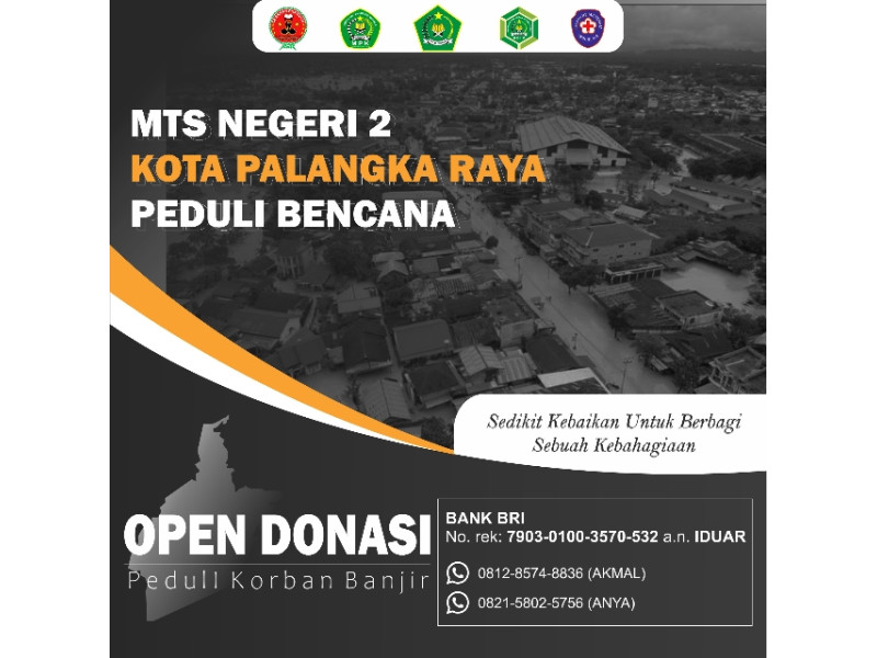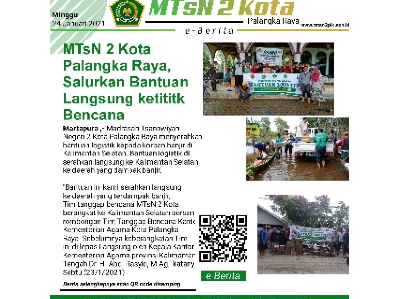 Madrasah Tsanawiyah Negeri 2 Kota Palangka Raya menyerahkan bantuan logistik kepada korban banjir di Kalimantan Selatan. Bantuan logistik di serahkan langsung ke Kalimantan Selatan ke daerah yang dampak banjir."Bantuan ini kami serahkan langsung ke daerah yang terdampak banjir, Tim tanggap...