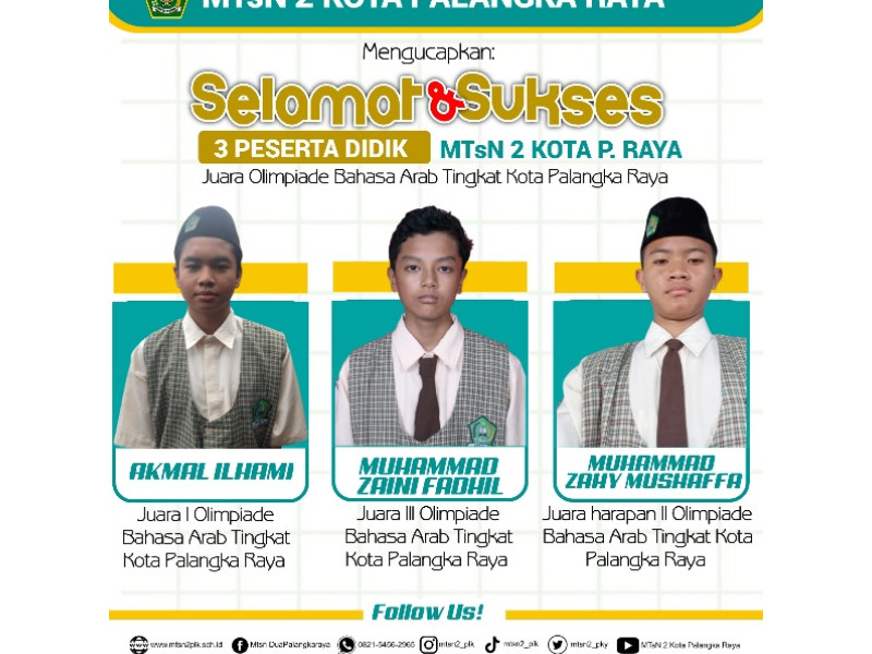 Prestasi membanggakan kembali ditorehkan oleh peserta didik MTsN 2 Kota Palangka Raya dalam ajang Olimpiade Bahasa Arab Tingkat Kota Palangka Raya yang diselenggarakan oleh Musyawarah Guru Mata Pelajaran (MGMP) Bahasa Arab se-Indonesia. Tiga siswa berhasil meraih gelar juara dan mengharumkan...